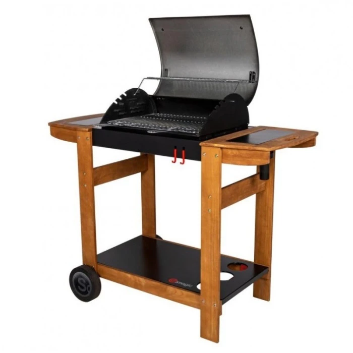 Les grilles de cuisson offrent un maintien au chaud grâce à l’acier chromé. Le chariot est stbale et robuste avec des tablettes latérales en bois, ce qui facilite le déplacement du barbecue et la cuisine sur plan de travail.