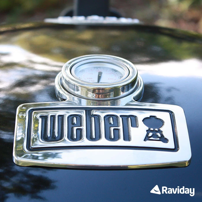 Un badge « Premium » aux couleurs de Weber est positionné sous le thermomètre.