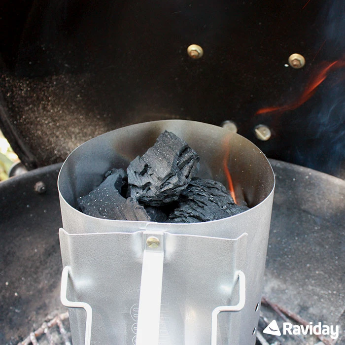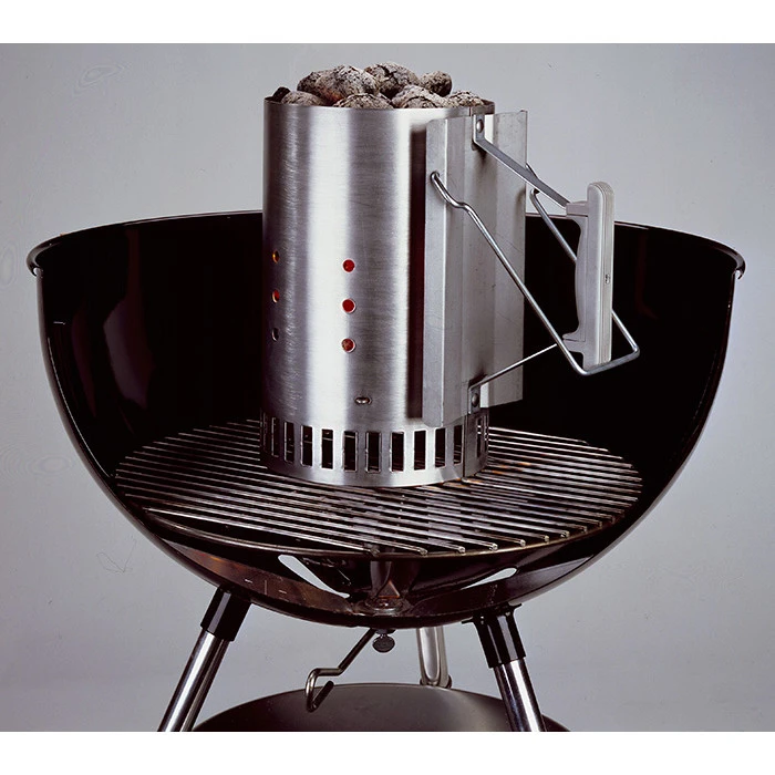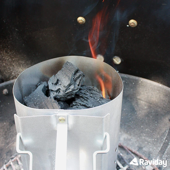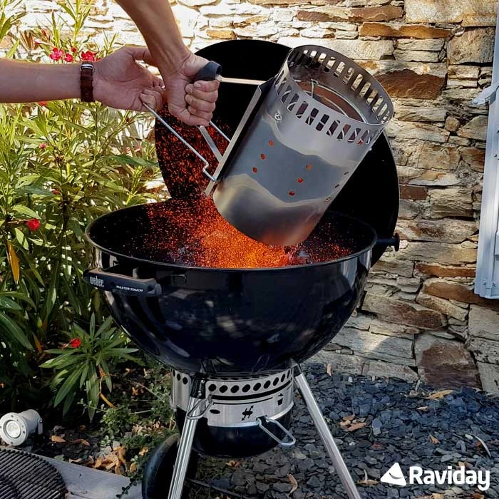 - La cheminée d’allumage (Ø 19 x H 31 cm) : elle permet de mettre la quantité suffisante de briquettes de charbon. Une fois celle-ci remplie il suffit de la poser sur la grille foyère en recouvrant les cubes allume-feux.