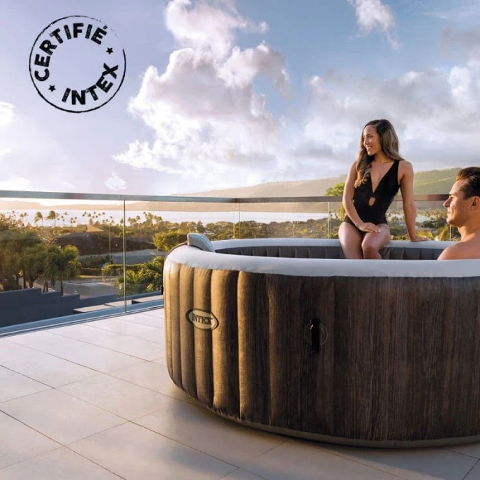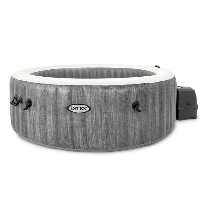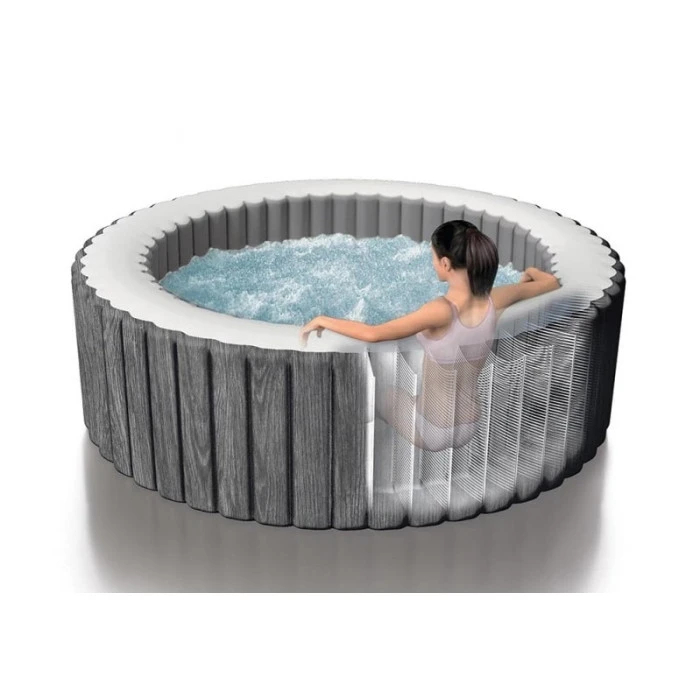 Avec ce spa Baltik, Intex propose un 4ème coloris de spa gonflable, il s’agit d’un aspect Bois de couleur grise.