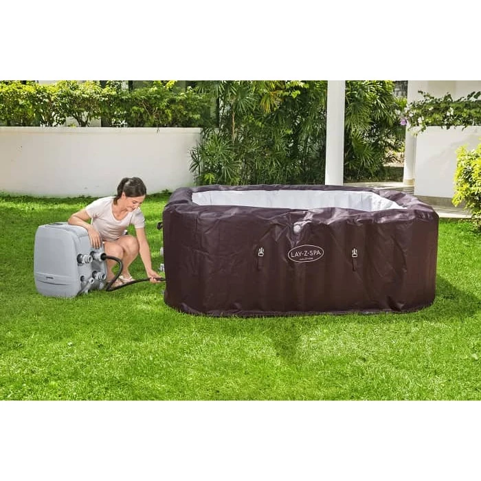 Ne nécessitant aucune installation ou des outils professionnels, le spa Maldives peut être gonflé (en utilisant l’appareil de chauffage / pompe à air inclus) et prêt à l’usage en seulement 10 minutes !